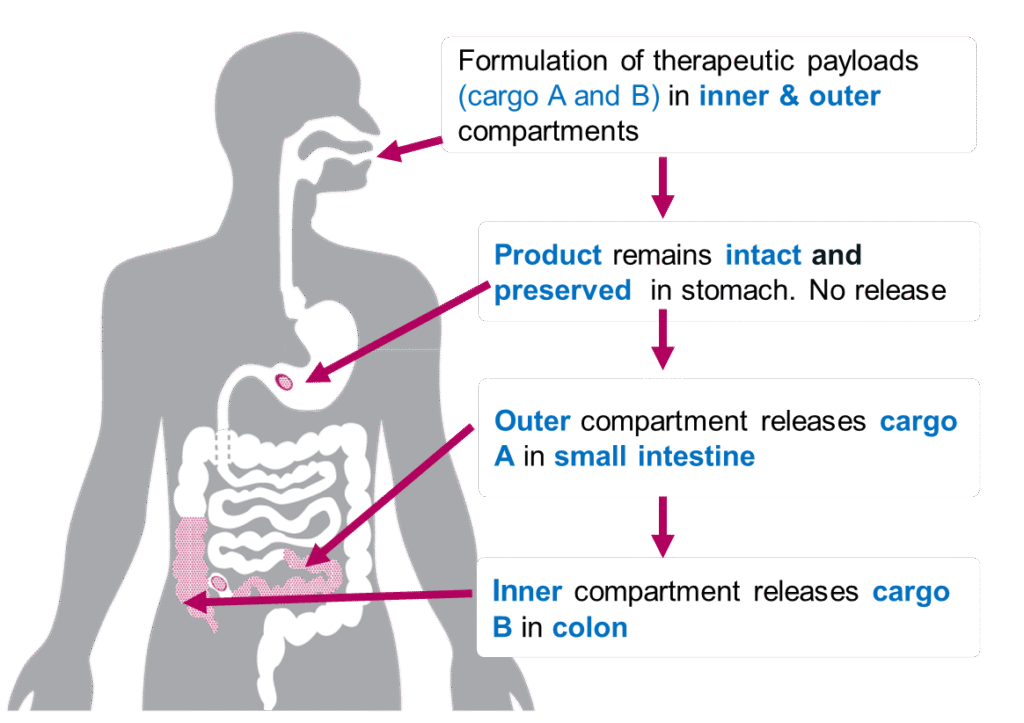 • The platform is suitable for targeted oral delivery of small molecules and biologics, including vaccines to the colon or to both small intestine and colon.